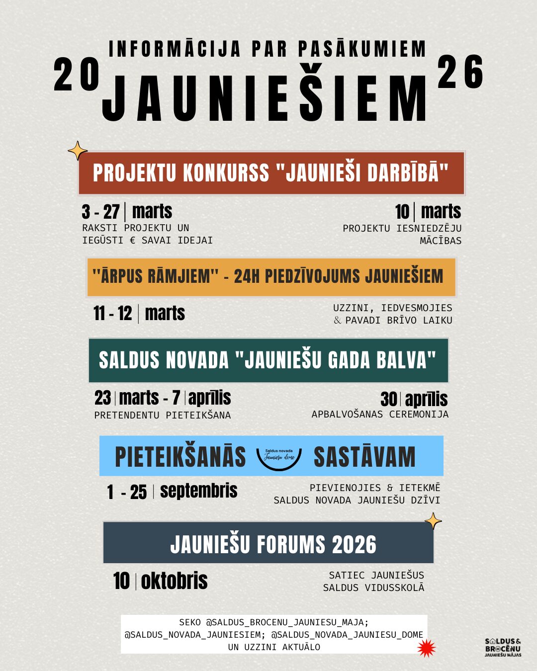 Saldus un Brocēnu jauniešu mājas apkopojušas informāciju par lielākajiem pasākumiem jauniešiem Saldus novadā, aicinām atzīmēt kalendāros un informēt jauniešus!